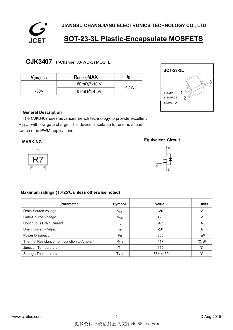 JIANGSUCHANGJIANGELECTRONICSTECHNOLOGYCO.,LTDSOT-23-3LPlastic-EncapsulateMOSFETSGeneralDescriptionTheCJK3407usesadvancedtrenchtechnologytoprovideexcellentRDS(on)withlowgatecharge.Thisdeviceissuitab...