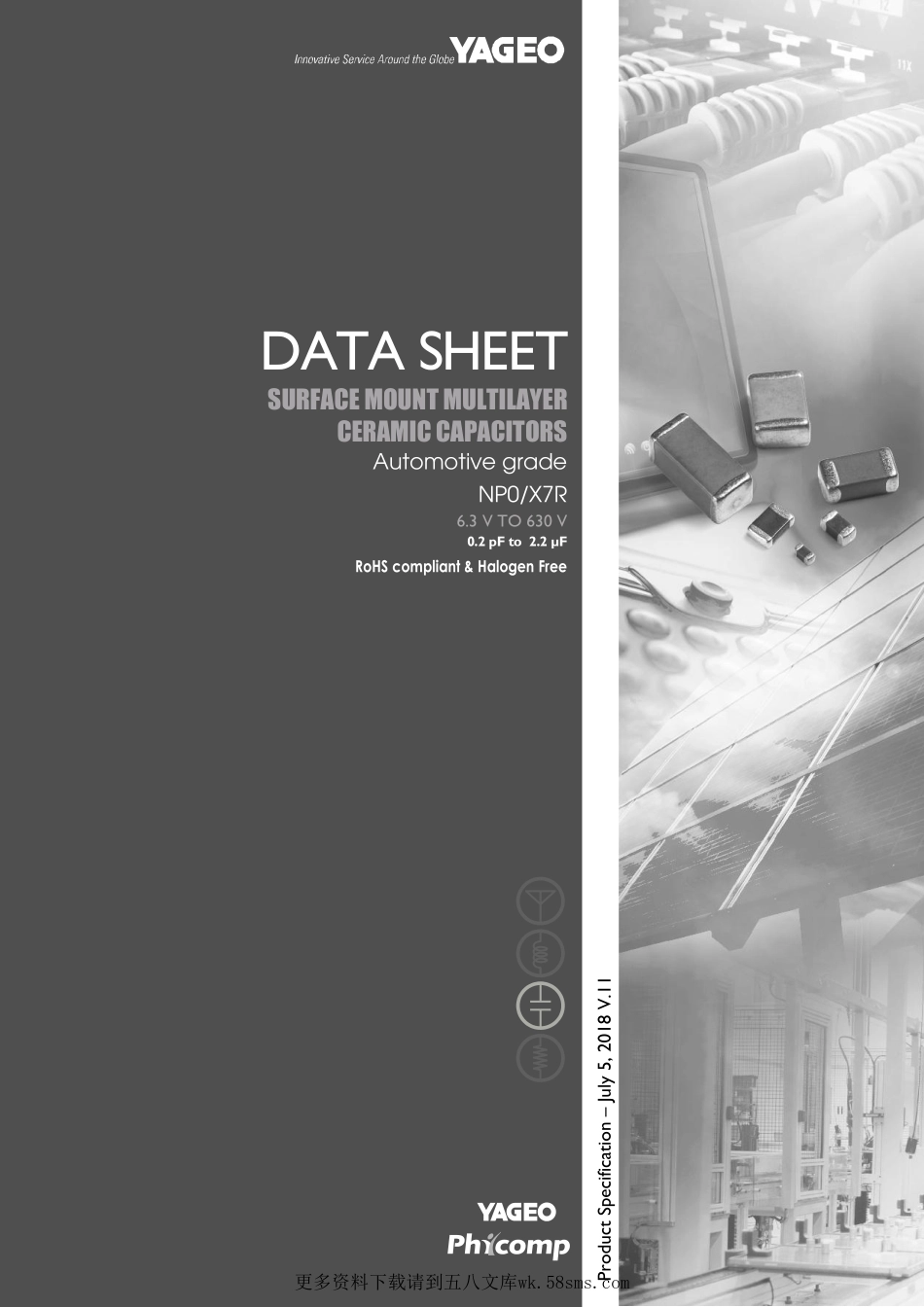 85ProductSpecification–July5,2018V.11DATASHEETSURFACEMOUNTMULTILAYERCERAMICCAPACITORSAutomotivegradeNP0/X7R6.3VTO630V0.2pFto2.2µFRoHScompliant&HalogenFree更多资料下载请到五八文库wk.58sms.comAutom...