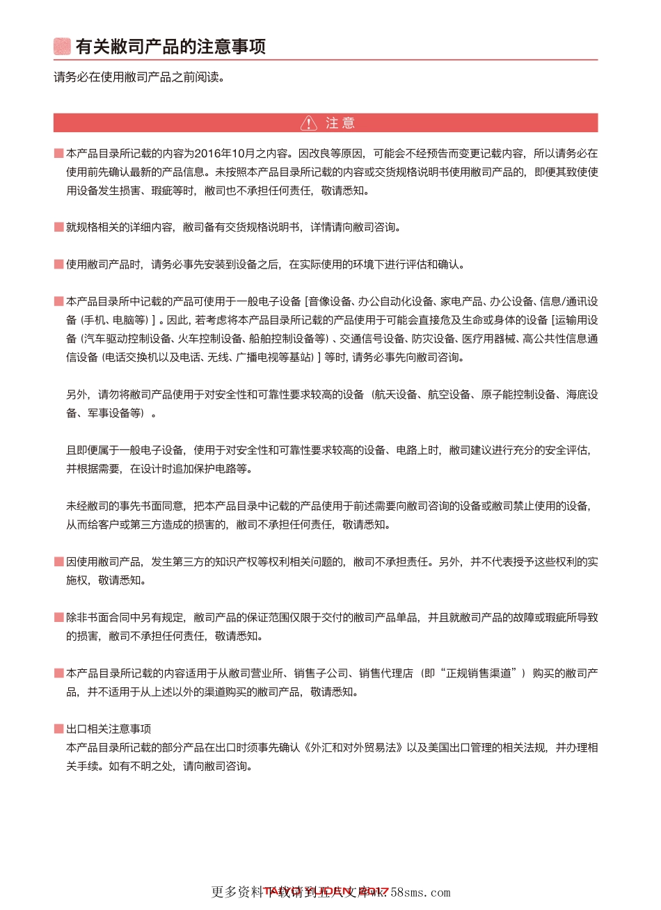 注意■本产品目录所记载的内容为2016年10月之内容。因改良等原因,可能会不经预告而变更记载内容,所以请务必在使用前先确认最新的产品信息。未按照本产品目录所记载的内容或交货规格说明书使用敝司产品的,即便...