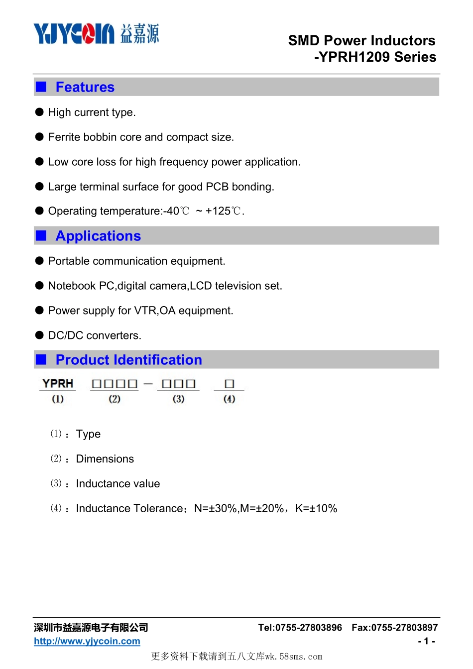 SMDPowerInductors-YPRH1209Series深圳市益嘉源电子有限公司Tel:0755-27803896Fax:0755-27803897http://www.yjycoin.com-1-■Features●Highcurrenttype.●Ferritebobbincoreandcompactsize.●Lowcorelossforhigh...