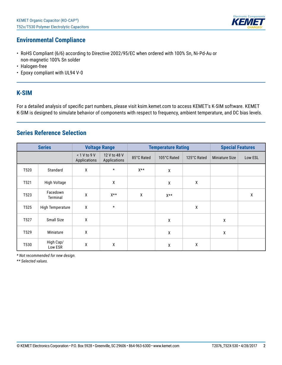 ©KEMETElectronicsCorporation•P.O.Box5928•Greenville,SC29606•864-963-6300•www.kemet.comT2076_T52X-530•4/28/20171Oneworld.OneKEMETOverviewTheKEMETOrganicCapacitor(KO-CAP)isasolidelectrolyticcap...