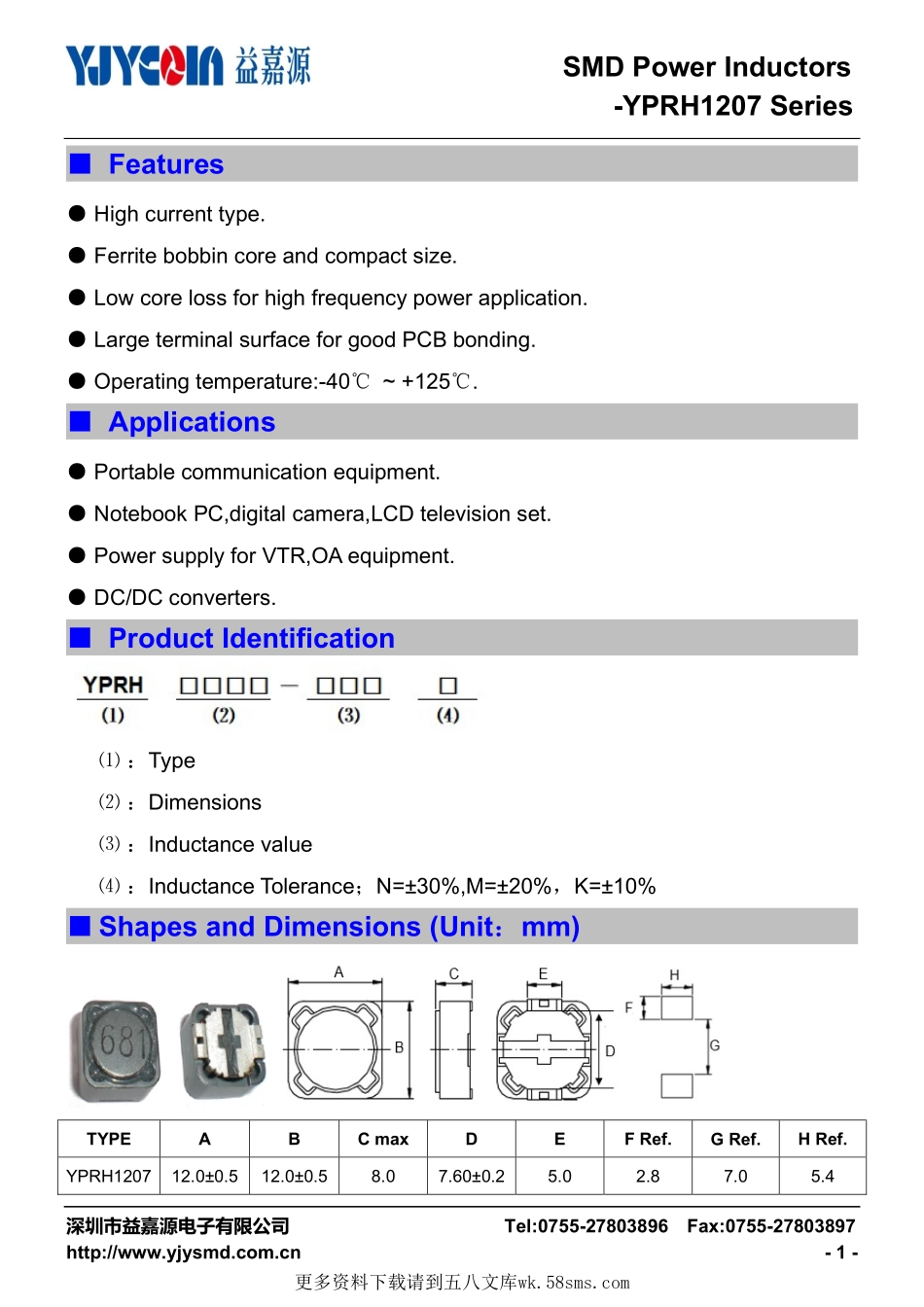 SMDPowerInductors-YPRH1207Series深圳市益嘉源电子有限公司Tel:0755-27803896Fax:0755-27803897http://www.yjysmd.com.cn-1-■Features●Highcurrenttype.●Ferritebobbincoreandcompactsize.●Lowcorelossforhi...