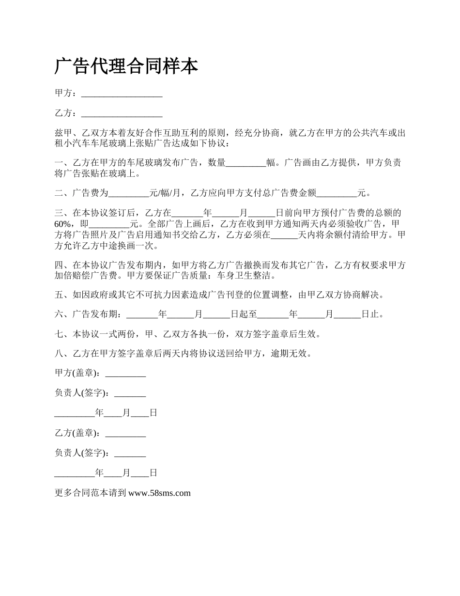 广告代理合同样本甲方:__________________乙方:__________________兹甲、乙双方本着友好合作互助互利的原则,经充分协商,就乙方在甲方的公共汽车或出租小汽车车尾玻璃上张贴广告达成如下协议:一、乙方在甲方...