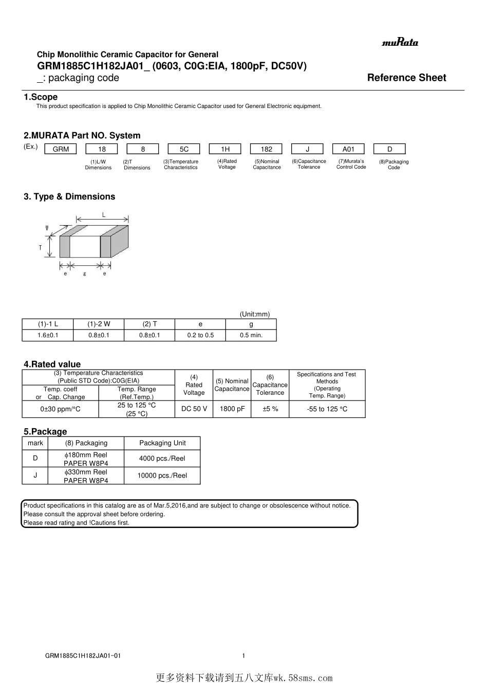 GRM1885C1H182JA01_(0603,C0G:EIA,1800pF,DC50V)_:packagingcodeReferenceSheet1.Scope2.MURATAPartNO.System(Ex.)3.Type&Dimensions(Unit:mm)4.Ratedvalue5.PackageProductspecificationsinthiscatalogareasofMa...