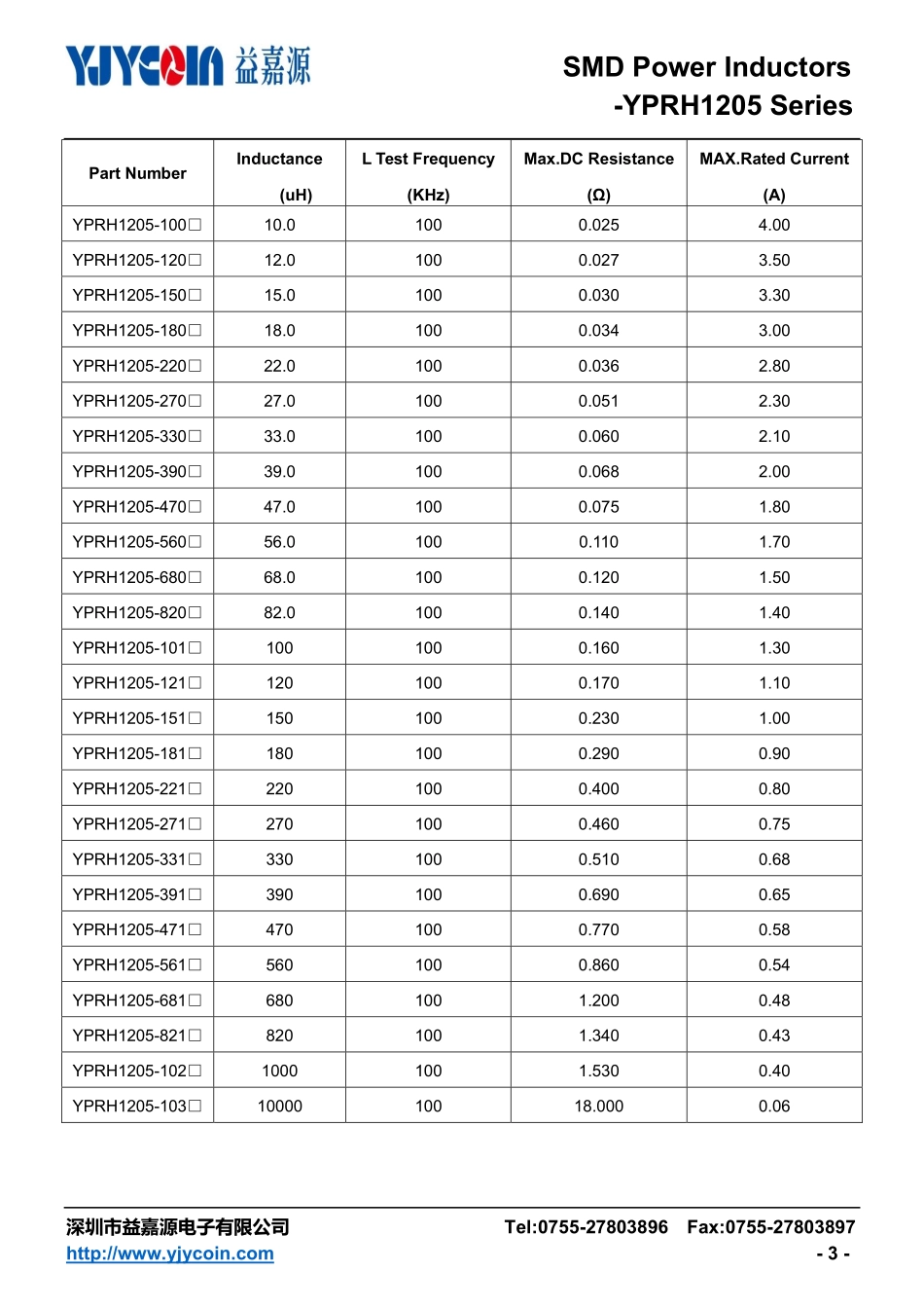 SMDPowerInductors-YPRH1205Series深圳市益嘉源电子有限公司Tel:0755-27803896Fax:0755-27803897http://www.yjycoin.com-1-■Features●Highcurrenttype.●Ferritebobbincoreandcompactsize.●Lowcorelossforhigh...