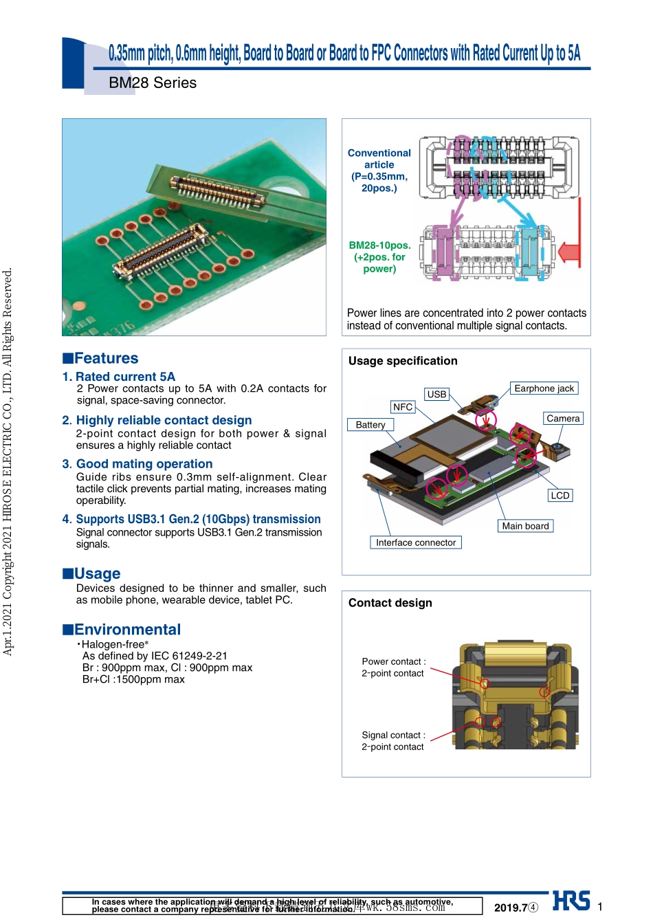 12019.7④0.35mmpitch,0.6mmheight,BoardtoBoardorBoardtoFPCConnectorswithRatedCurrentUpto5ABM28Series■Features1.Ratedcurrent5A2Powercontactsupto5Awith0.2Acontactsforsignal,space-savingconnector.2.Hi...