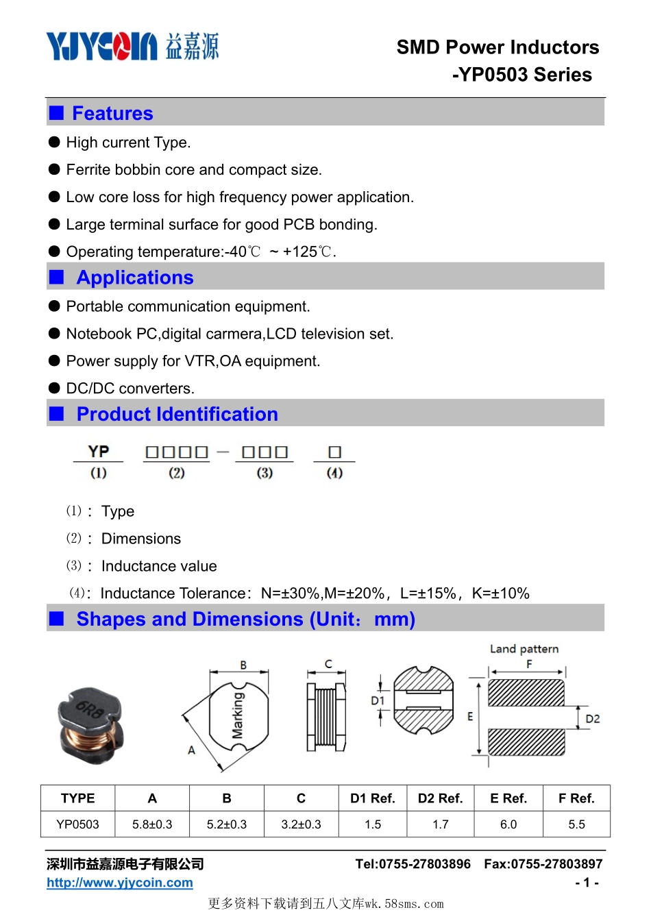 SMDPowerInductors-YP0503Series深圳市益嘉源电子有限公司Tel:0755-27803896Fax:0755-27803897http://www.yjycoin.com-1-■Features●HighcurrentType.●Ferritebobbincoreandcompactsize.●Lowcorelossforhighfr...
