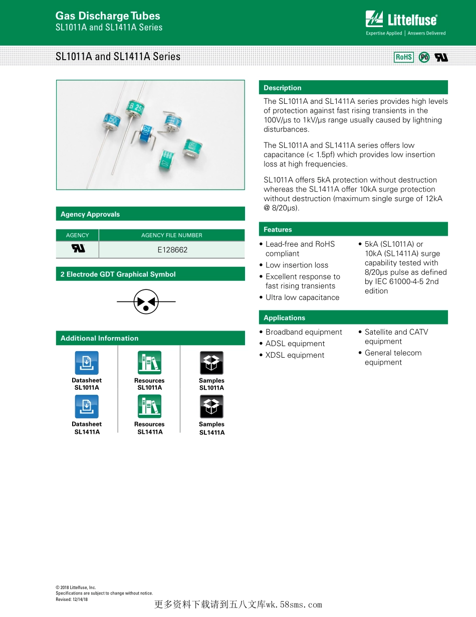 GasDischargeTubes©2018Littelfuse,Inc.Specificationsaresubjecttochangewithoutnotice.Revised:12/14/18SL1011AandSL1411ASeriesDescriptionFeatures•Lead-freeandRoHScompliant•Lowinsertionloss•Excellen...