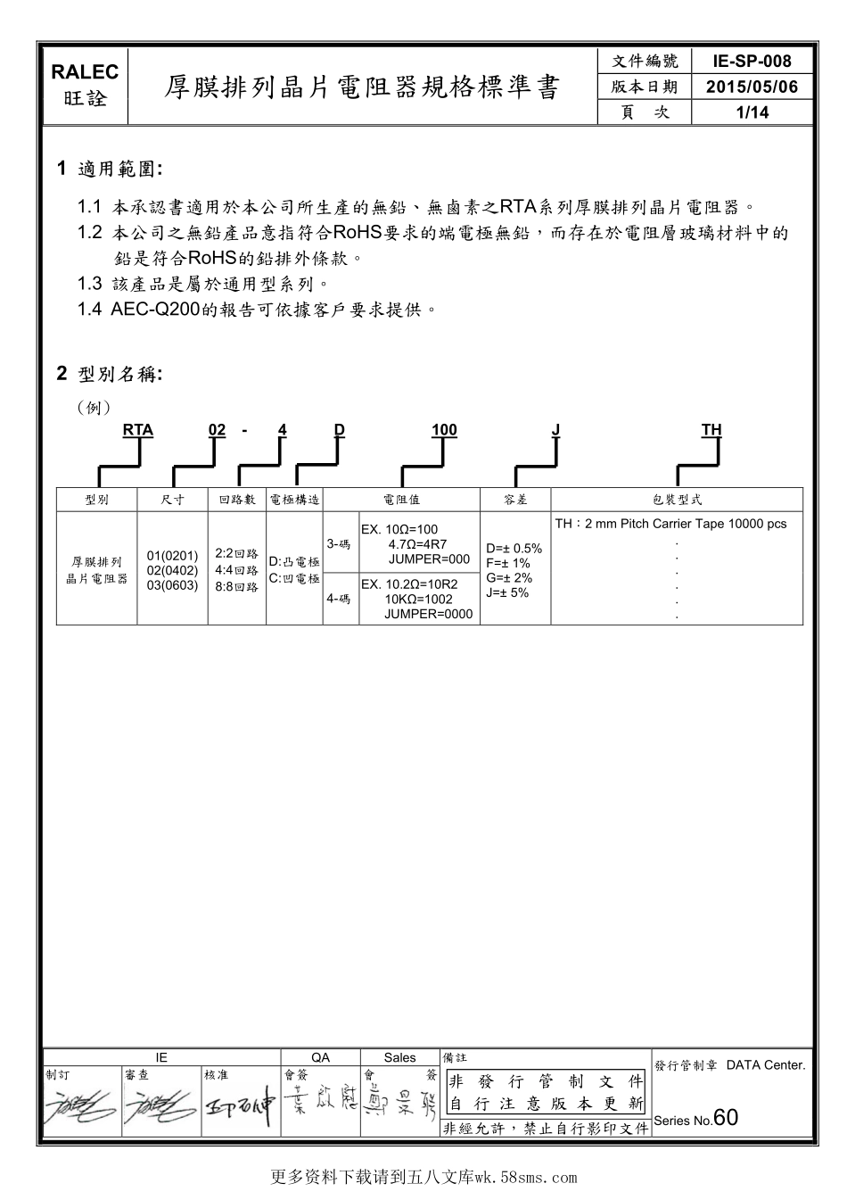 RALEC旺詮厚膜排列晶片電阻器規格標準書文件編號IE-SP-008版本日期2015/05/06頁次1/14IEQASales備註發行管制章DATACenter.SeriesNo.60制訂審查核准會簽會簽非經允許,禁止自行影印文件非發行管制文件自行注意版本...