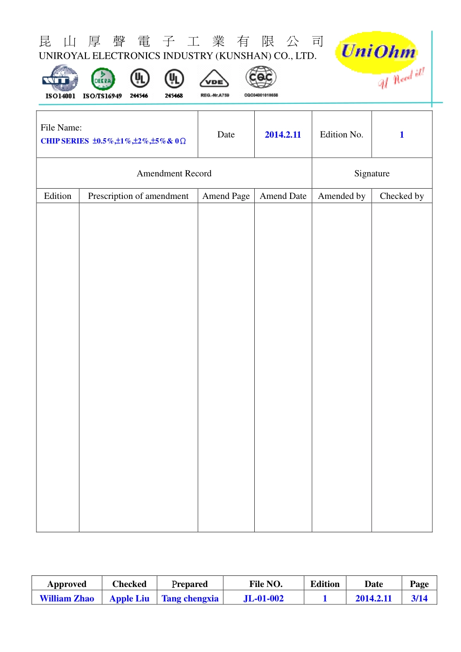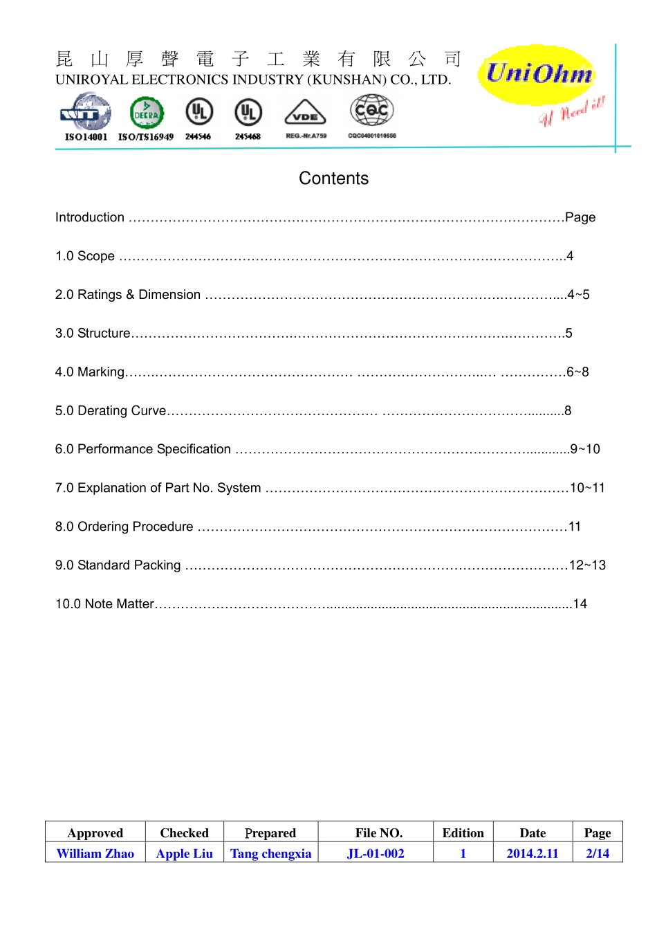 昆山厚聲電子工業有限公司UNIROYALELECTRONICSINDUSTRY(KUNSHAN)CO.,LTD.ApprovedCheckedPreparedFileNO.EditionDatePageWilliamZhaoAppleLiuTangchengxiaJL-01-00212014.2.111/14SpecificationforApproval21XIAJ...