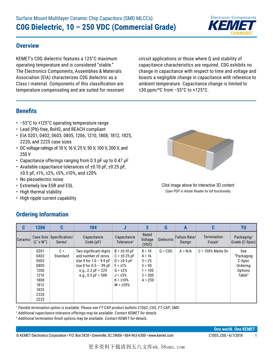 ©KEMETElectronicsCorporation•P.O.Box5928•Greenville,SC29606•864-963-6300•www.kemet.comC1003_C0G•6/7/20181Oneworld.OneKEMETBenefits•−55°Cto+125°Coperatingtemperaturerange•Lead(Pb)-free,Ro...