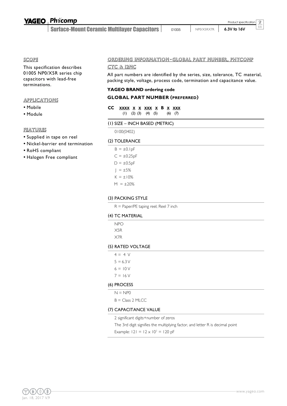 ProductSpecification–January18,2017V.9DATASHEETSURFACE-MOUNTCERAMICMULTILAYERCAPACITORS01005NP0/X5R/X7R4VTO16V0.5pFto220nFRoHScompliant&HalogenFree更多资料下载请到五八文库wk.58sms.comwww.yageo.com...