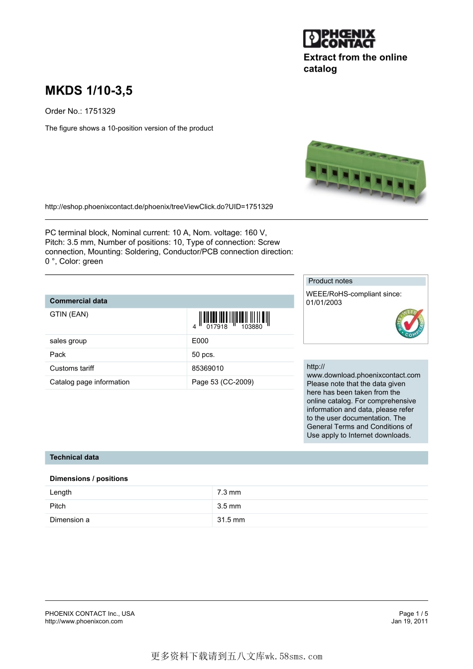 PHOENIXCONTACTInc.,USAPage1/5http://www.phoenixcon.comJan19,2011ExtractfromtheonlinecatalogMKDS1/10-3,5OrderNo.:1751329Thefigureshowsa10-positionversionoftheproducthttp://eshop.phoenixcontact.de/ph...