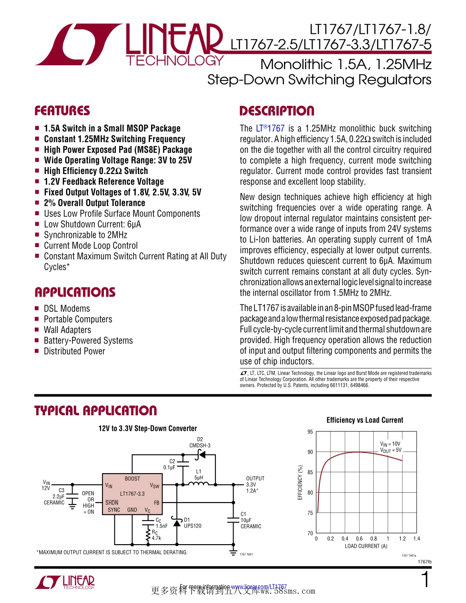 LT1767/LT1767-1.8/LT1767-2.5/LT1767-3.3/LT1767-511767fbFormoreinformationwww.linear.com/LT1767TypicalapplicaTionDescripTionMonolithic1.5A,1.25MHzStep-DownSwitchingRegulatorsL,LT,LTC,LTM,LinearTechn...