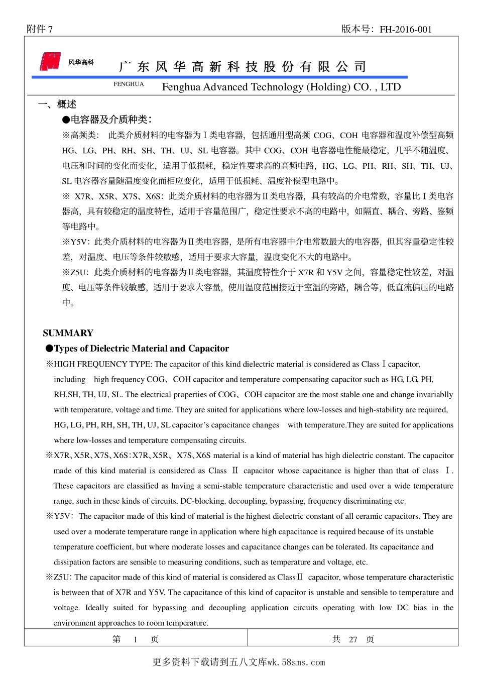 附件7版本号:FH-2016-001风华高科广东风华高新科技股份有限公司FENGHUAFenghuaAdvancedTechnology(Holding)CO.,LTD一、概述●电容器及介质种类:※高频类:此类介质材料的电容器为Ⅰ类电容器,包括通用型高频COG...