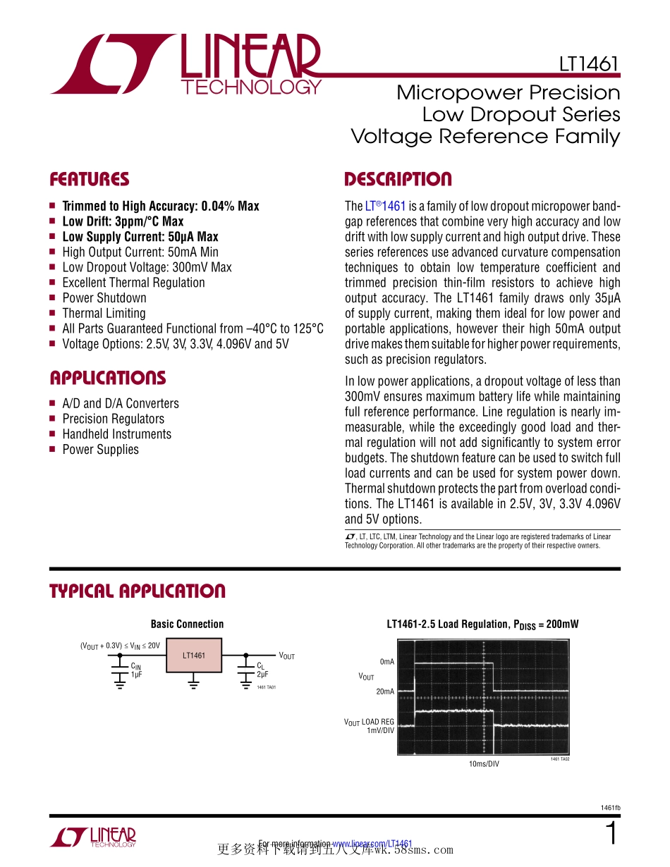 LT146111461fbFormoreinformationwww.linear.com/LT1461TypicalapplicaTionFeaTuresDescripTionMicropowerPrecisionLowDropoutSeriesVoltageReferenceFamilyTheLT®1461isafamilyoflowdropoutmicropowerband-gapr...