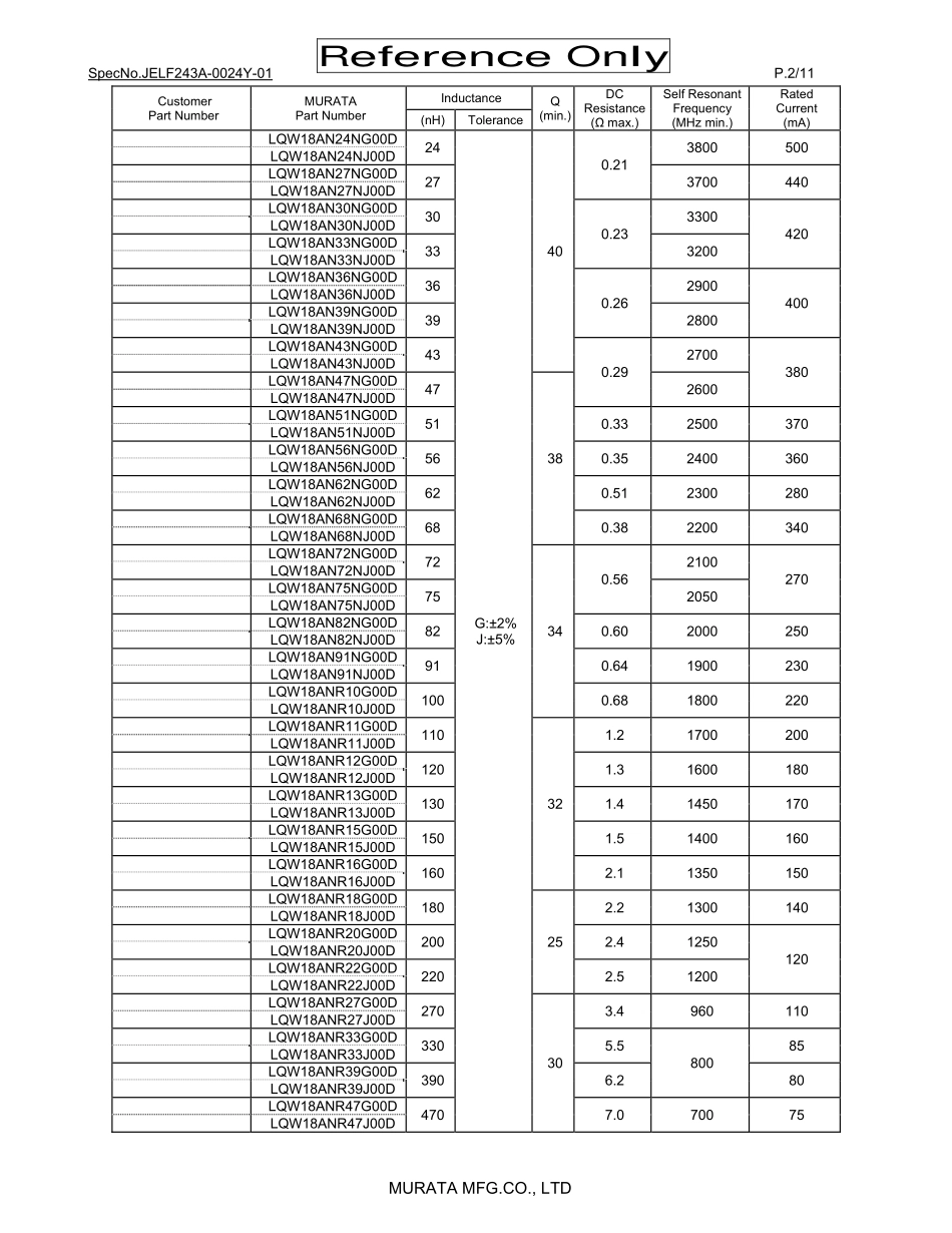 SpecNo.JELF243A-0024Y-01P.1/11MURATAMFG.CO.,LTDReferenceOnlyCHIPCOIL(CHIPINDUCTORS)LQW18AN□□□□00DREFERENCESPECIFICATION1.ScopeThisreferencespecificationappliestoLQW18AN_00series,Chipcoil(ChipIn...