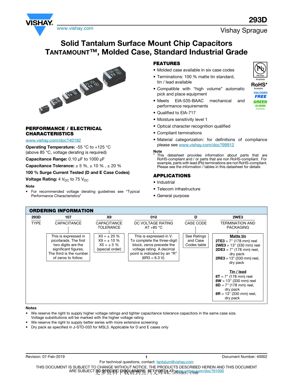 293Dwww.vishay.comVishaySpragueRevision:07-Feb-20191DocumentNumber:40002Fortechnicalquestions,contact:tantalum@vishay.comTHISDOCUMENTISSUBJECTTOCHANGEWITHOUTNOTICE.THEPRODUCTSDESCRIBEDHEREINANDTHIS...