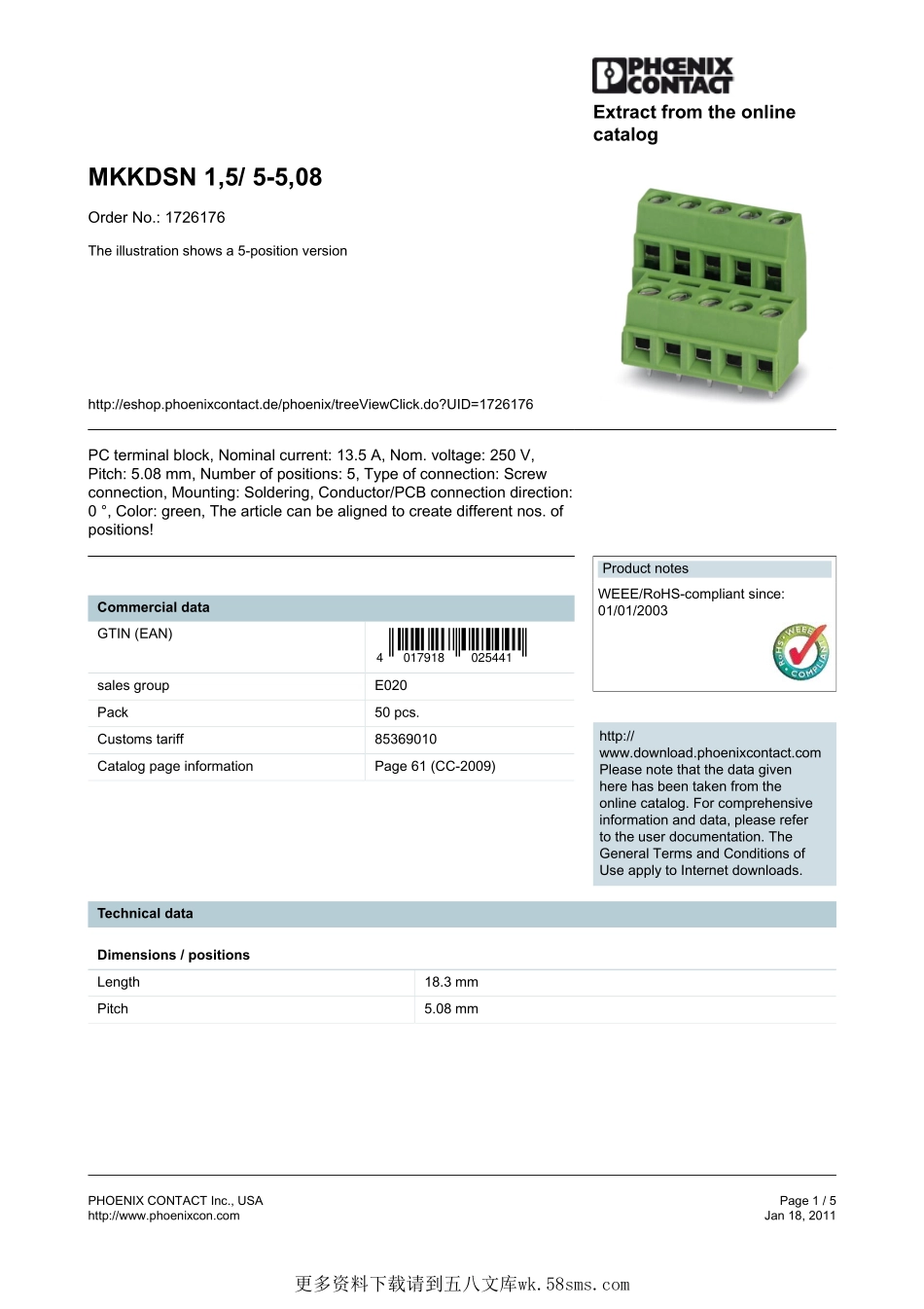 PHOENIXCONTACTInc.,USAPage1/5http://www.phoenixcon.comJan18,2011ExtractfromtheonlinecatalogMKKDSN1,5/5-5,08OrderNo.:1726176Theillustrationshowsa5-positionversionhttp://eshop.phoenixcontact.de/phoen...