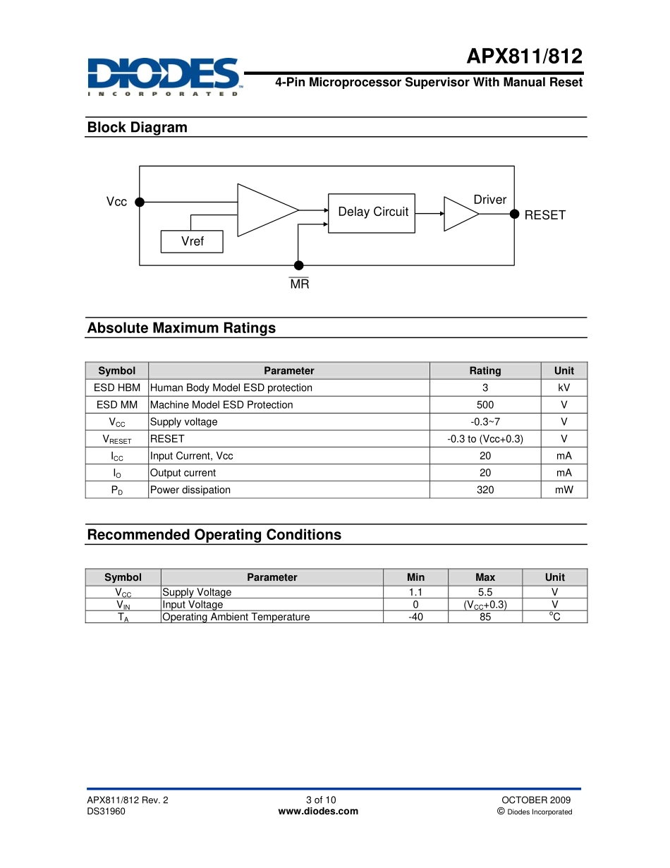 APX811/8124-PinMicroprocessorSupervisorWithManualResetAPX811/812Rev.21of10OCTOBER2009DS31960www.diodes.com©DiodesIncorporated•PrecisionMonitorof(2.5V/3.0V/3.3V/5.0V)powersupplyvoltage•Fullspecif...