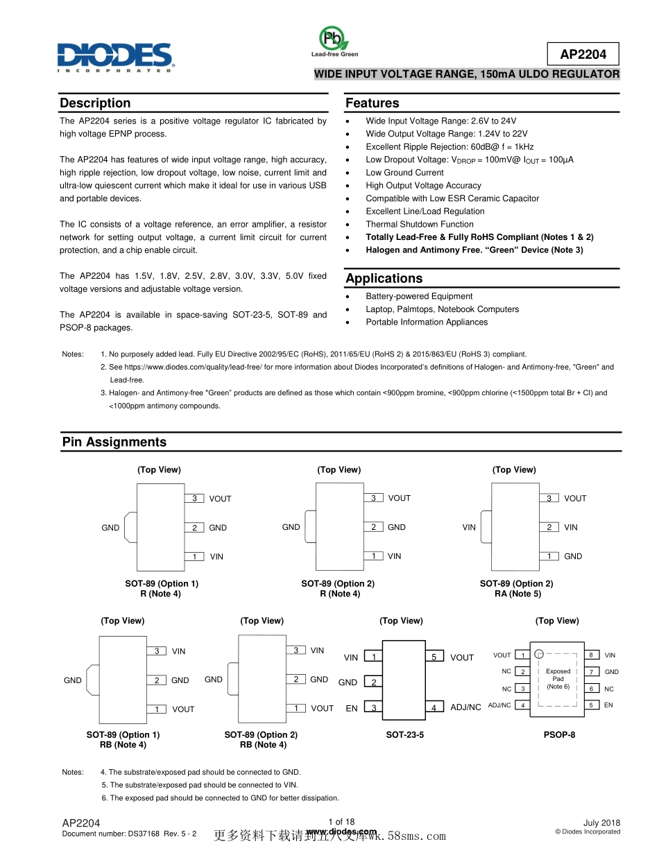 AP2204Documentnumber:DS37168Rev.5-21of18www.diodes.comJuly2018©DiodesIncorporatedAP2204WIDEINPUTVOLTAGERANGE,150mAULDOREGULATORDescriptionTheAP2204seriesisapositivevoltageregulatorICfabricatedbyhi...