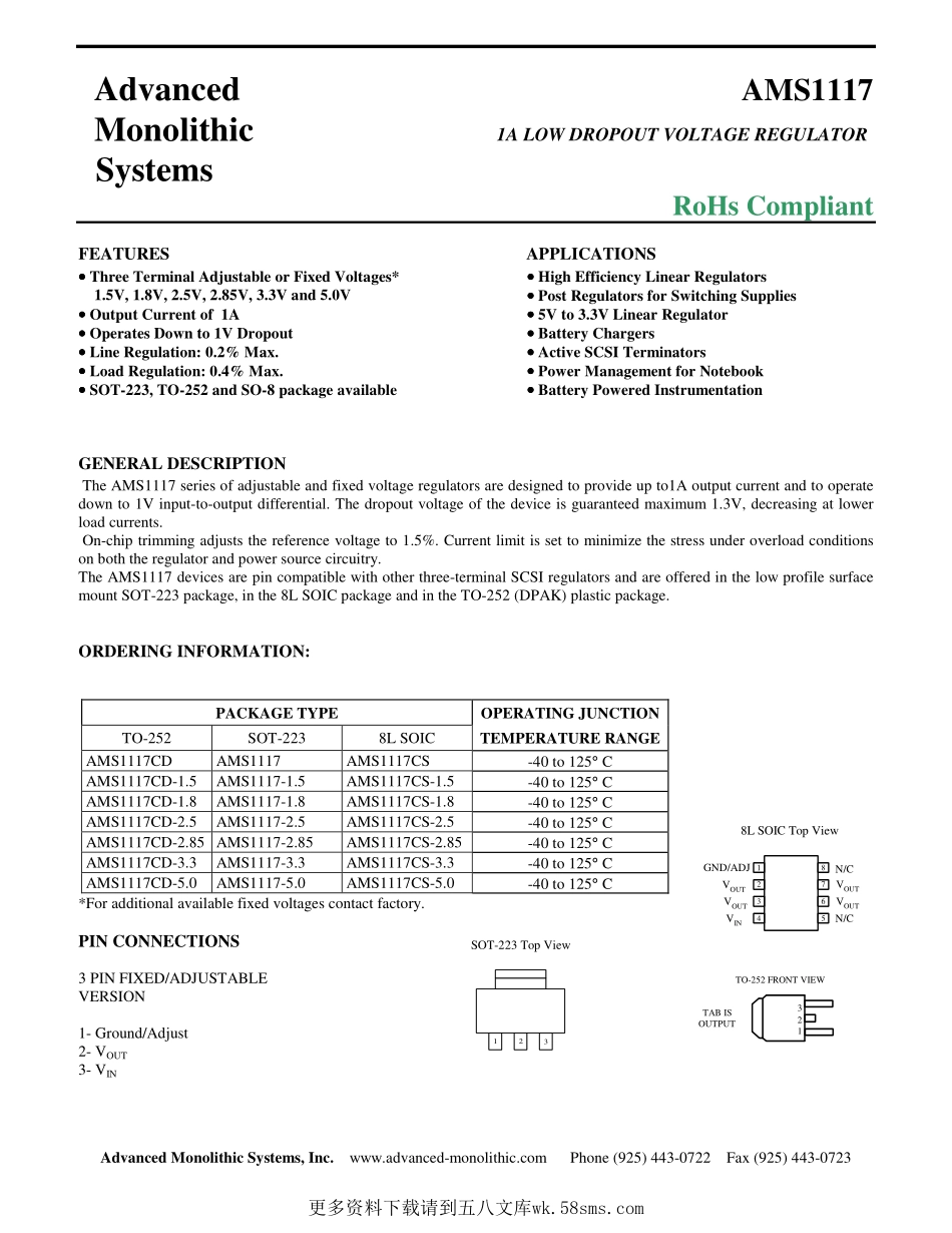 AdvancedMonolithicSystems,Inc.www.advanced-monolithic.comPhone(925)443-0722Fax(925)443-0723AdvancedAMS1117Monolithic1ALOWDROPOUTVOLTAGEREGULATORSystemsRoHsCompliantFEATURESAPPLICATIONS••••Three...