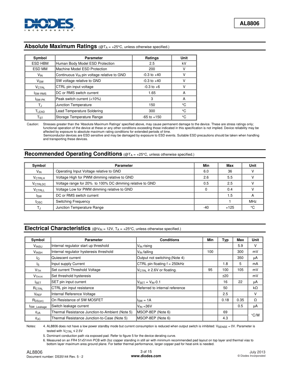 AL8806Documentnumber:DS35144Rev.5-21of15www.diodes.comJuly2013©DiodesIncorporatedAL8806HIGHEFFICIENCY36V1.5ABUCKLEDDRIVERDescriptionTheAL8806isastep-downDC/DCconverterdesignedtodriveLEDswithaconst...