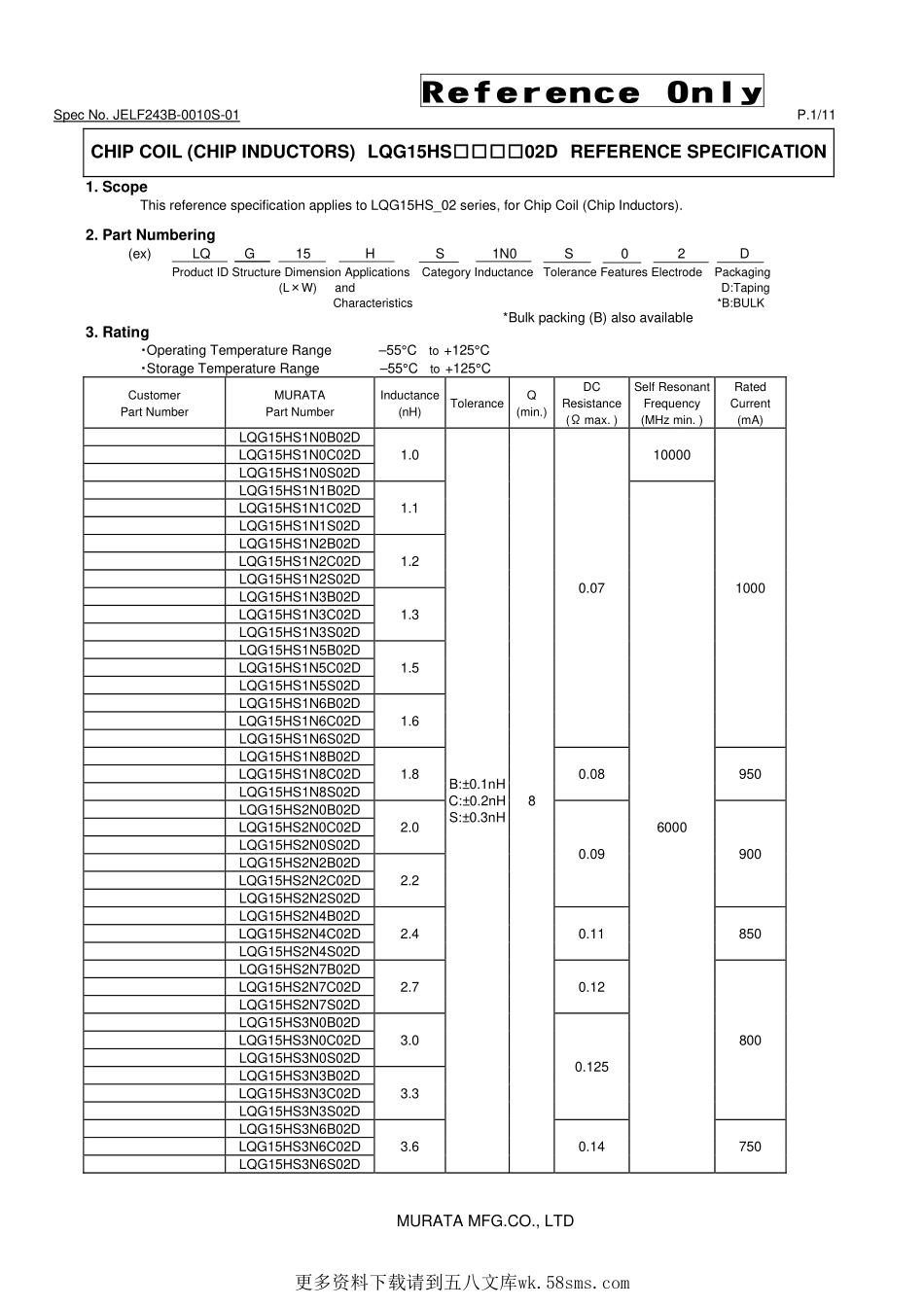 SpecNo.JELF243B-0010S-01P.1/11MURATAMFG.CO.,LTDReferenceOnlyCHIPCOIL(CHIPINDUCTORS)LQG15HS□□□□02DREFERENCESPECIFICATION1.ScopeThisreferencespecificationappliestoLQG15HS_02series,forChipCoil(Chi...