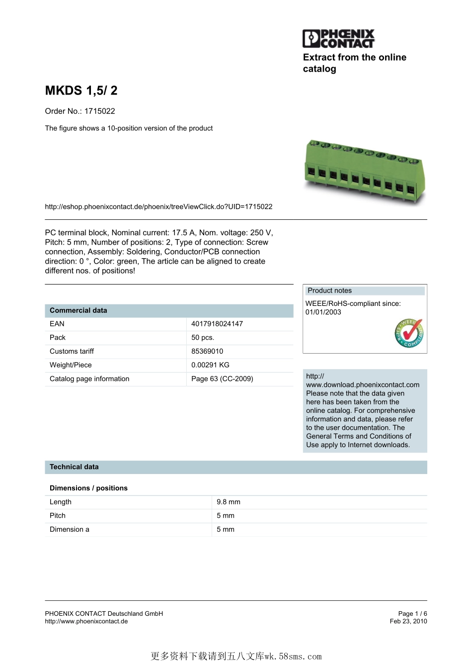 PHOENIXCONTACTDeutschlandGmbHPage1/6http://www.phoenixcontact.deFeb23,2010ExtractfromtheonlinecatalogMKDS1,5/2OrderNo.:1715022Thefigureshowsa10-positionversionoftheproducthttp://eshop.phoenixcontac...