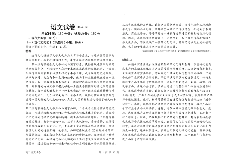 第1页共10页语文试卷2024.12考试时间:150分钟;试卷总分:150分一、现代文阅读(35分)(一)现代文阅读I(本题共5小题,19分)阅读下面的文字,完成1--5题。材料一:流行文化视域下民俗文化产品具有符号意义,与...