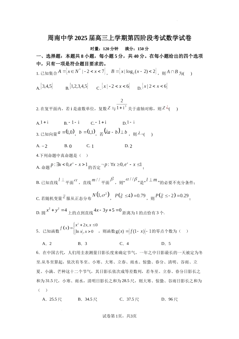 周南中学2025届高三上学期第四阶段考试数学试卷时量:120分钟满分:150分一、选择题:本题共8小题,每小题5分,共40分。在每小题给出的四个选项中,只有一项是符合题目要求的。1.已知集合,,则为()A.B.C.D.2.在...