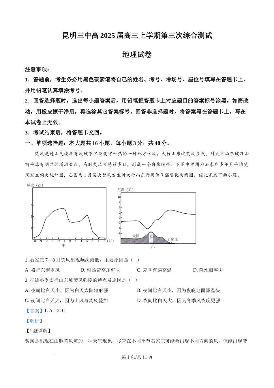 昆明三中高2025届高三上学期第三次综合测试地理试卷注意事项:1.答题前,考生务必用黑色碳素笔将自己的姓名、考号、考场号、座位号填写在答题卡上,并用铅笔认真填涂考号。2.回答选择题时,选出每小题答案后,...