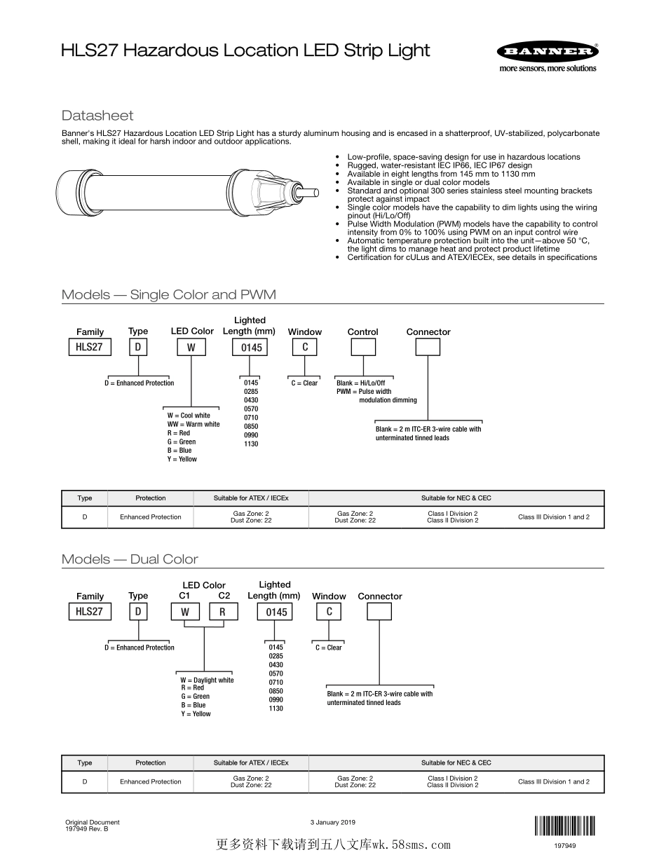 DatasheetBanner'sHLS27HazardousLocationLEDStripLighthasasturdyaluminumhousingandisencasedinashatterproof,UV-stabilized,polycarbonateshell,makingitidealforharshindoorandoutdoorapplications.•Low-pro...