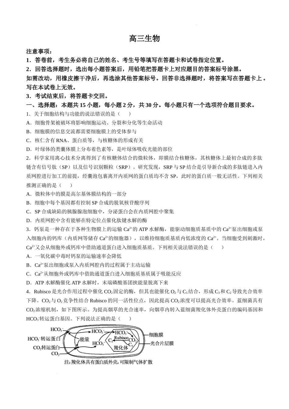 高三生物注意事项:1.答卷前,考生务必将自己的姓名、考生号等填写在答题卡和试卷指定位置。2.回答选择题时,选出每小题答案后,用铅笔把答题卡上对应题目的答案标号涂黑。如需改动,用橡皮擦干净后,再选涂其...