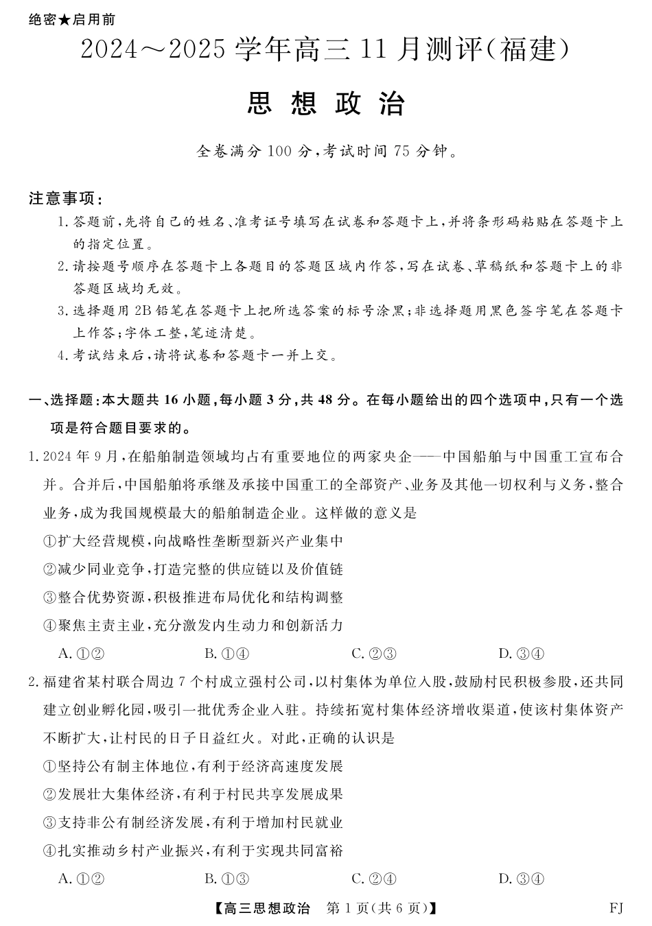 福建省2024-2025学年金科大联考高三11月测评 政治试题.pdf_第2页