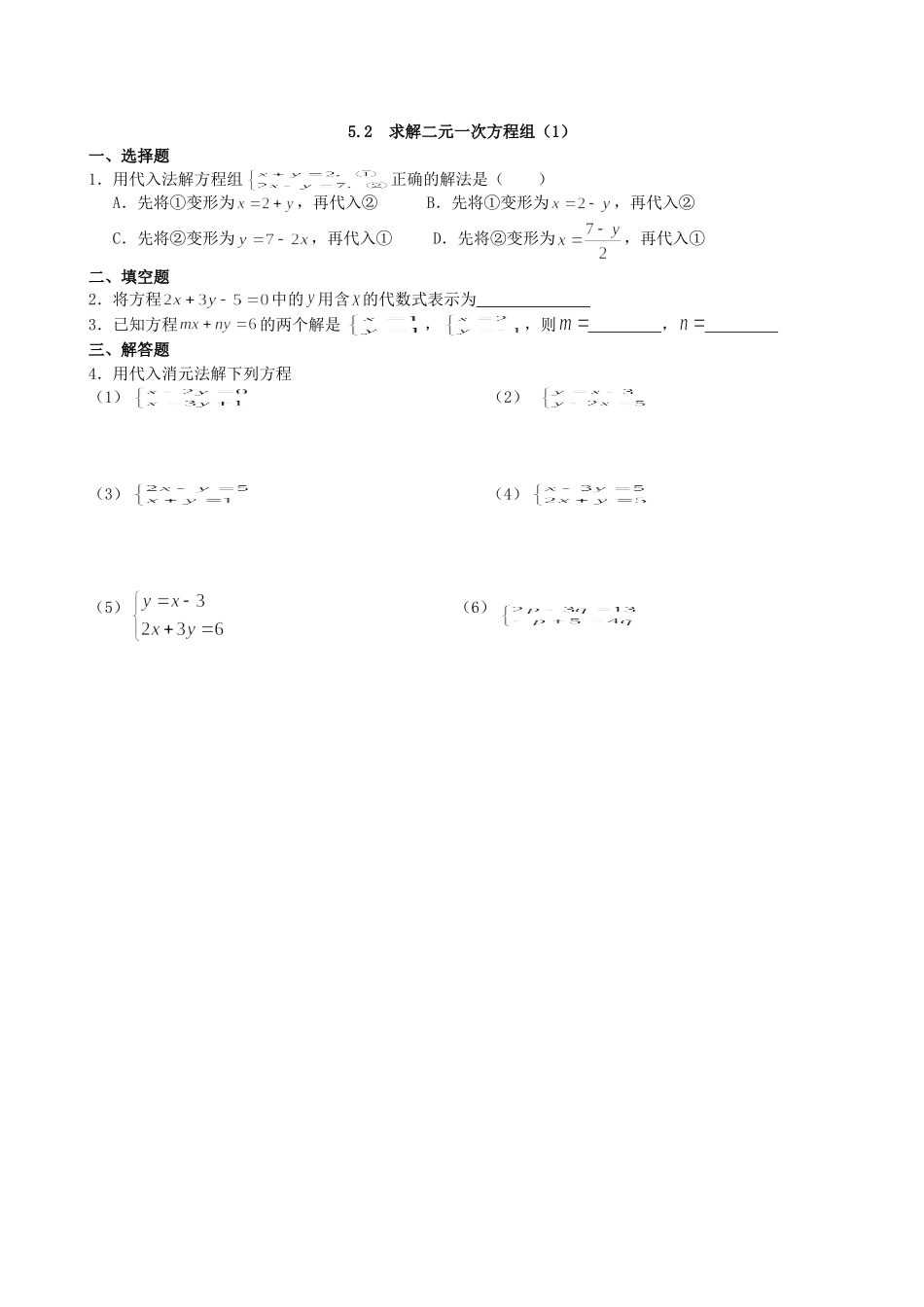 5.2求解二元一次方程组(1)一、选择题1.用代入法解方程组正确的解法是()A.先将①变形为,再代入②B.先将①变形为,再代入②C.先将②变形为,再代入①D.先将②变形为,再代入①二、填空题2.将方程中的用...