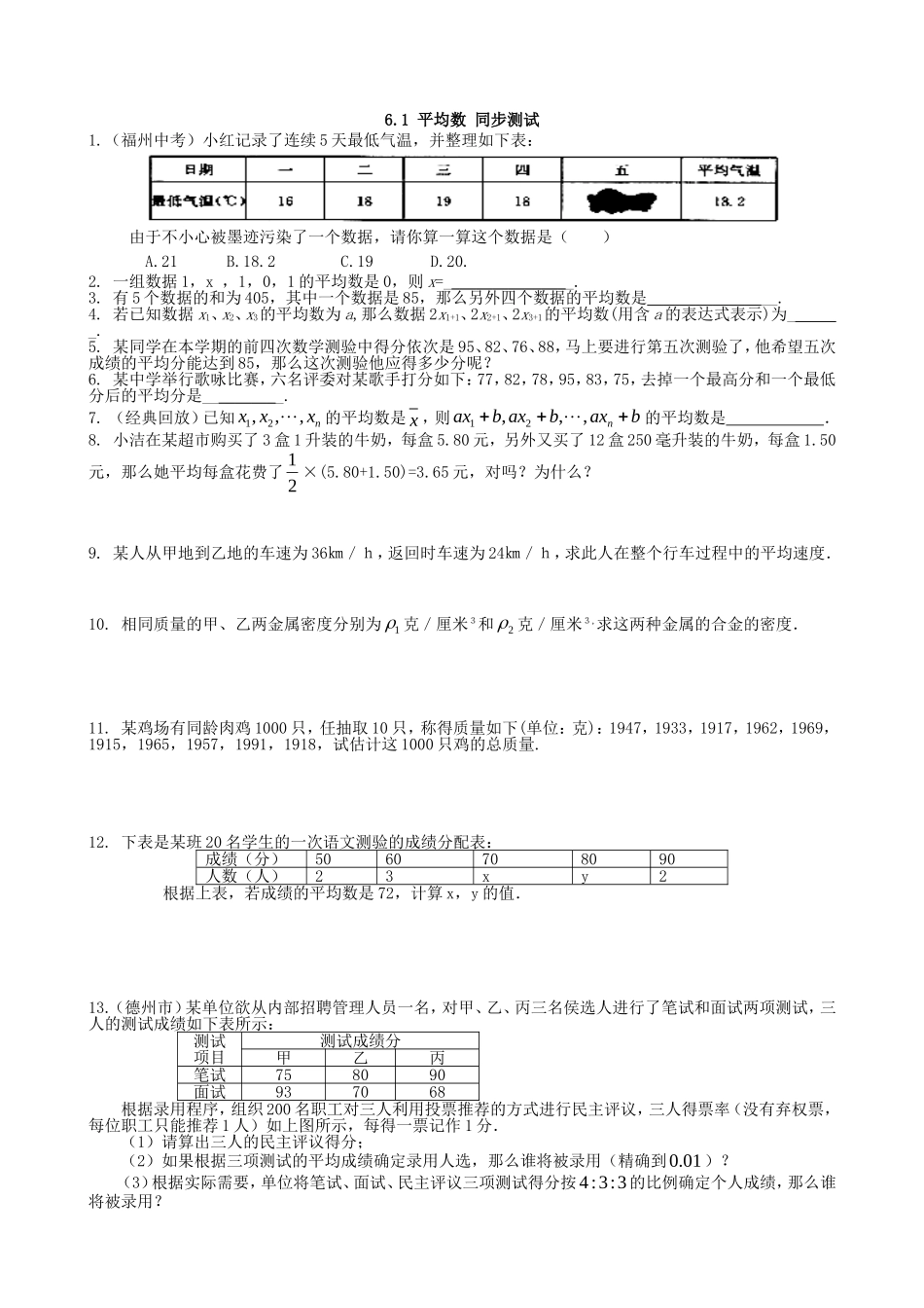 6.1平均数同步测试1.(福州中考)小红记录了连续5天最低气温,并整理如下表:由于不小心被墨迹污染了一个数据,请你算一算这个数据是()A.21B.18.2C.19D.20.2.一组数据1,x,1,0,1的平均数是0,则x=__________...