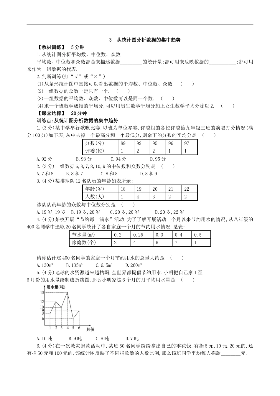 3从统计图分析数据的集中趋势【教材训练】5分钟1.从统计图分析平均数、中位数、众数平均数、中位数和众数都是来描述数据_________的统计量;都可用来反映数据的___________;都可用来作为一组数据的代表.2.判断训练...