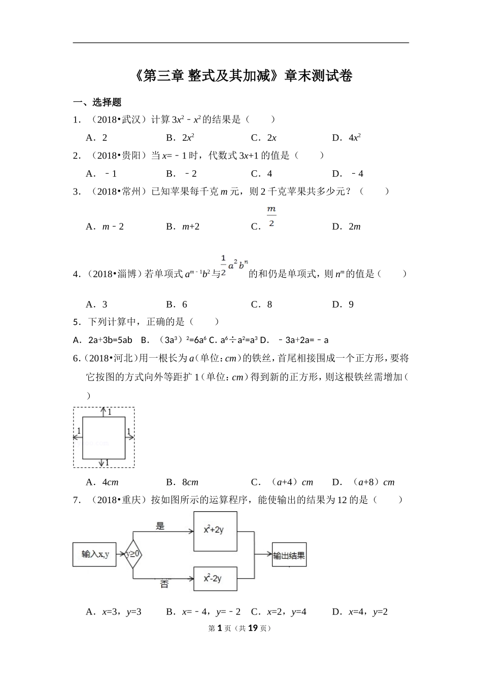 《第三章整式及其加减》章末测试卷一、选择题1.(2018•武汉)计算3x2﹣x2的结果是()A.2B.2x2C.2xD.4x22.(2018•贵阳)当x=﹣1时,代数式3x+1的值是()A.﹣1B.﹣2C.4D.﹣43.(2018•常州)已知苹...