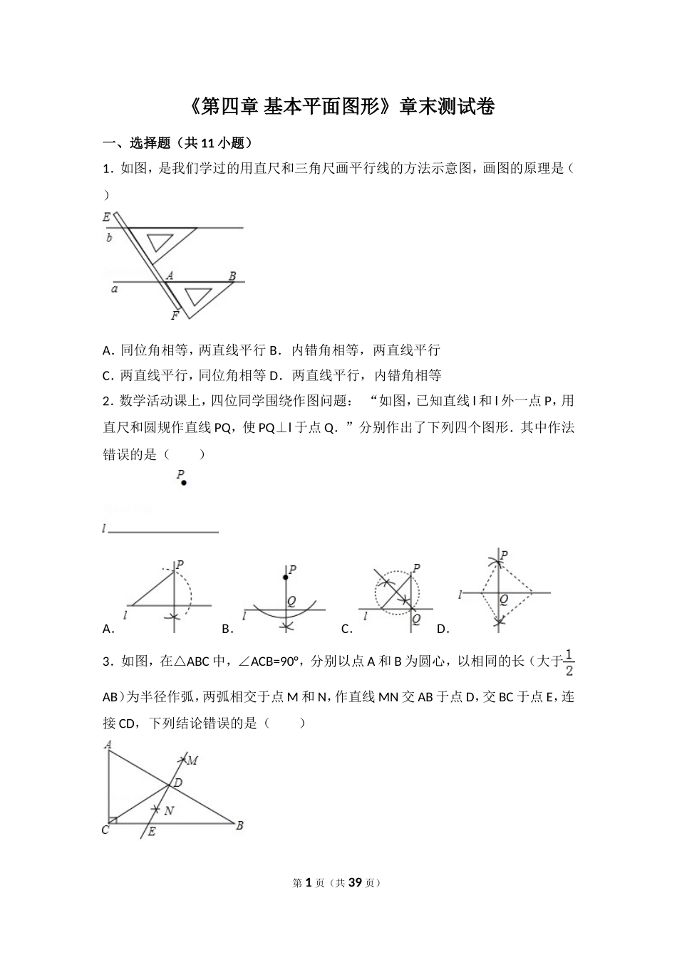 《第四章基本平面图形》章末测试卷一、选择题(共11小题)1.如图,是我们学过的用直尺和三角尺画平行线的方法示意图,画图的原理是()A.同位角相等,两直线平行B.内错角相等,两直线平行C.两直线平行,同位...