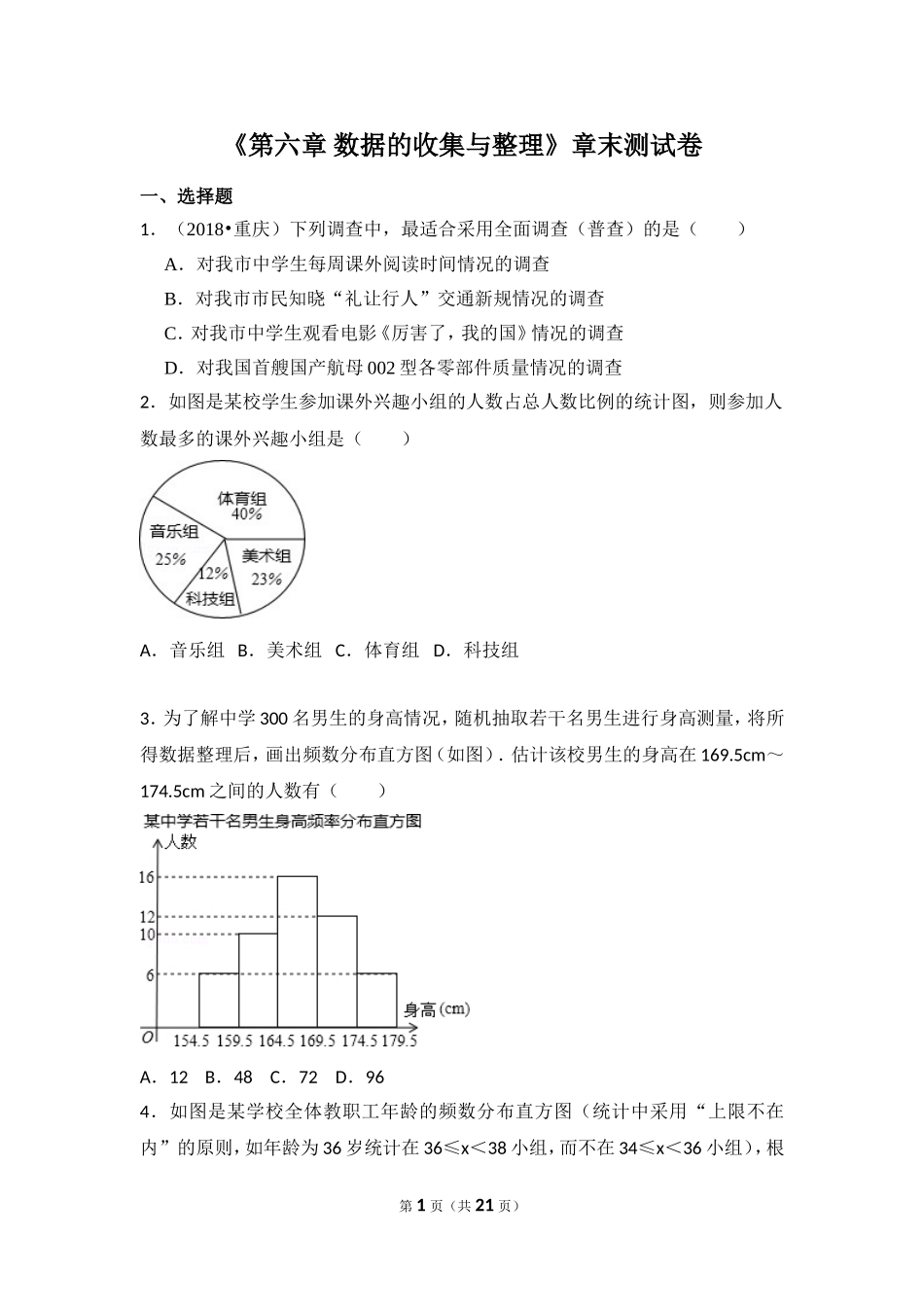《第六章数据的收集与整理》章末测试卷一、选择题1.(2018•重庆)下列调查中,最适合采用全面调查(普查)的是()A.对我市中学生每周课外阅读时间情况的调查B.对我市市民知晓“礼让行人”交通新规情况的调查...