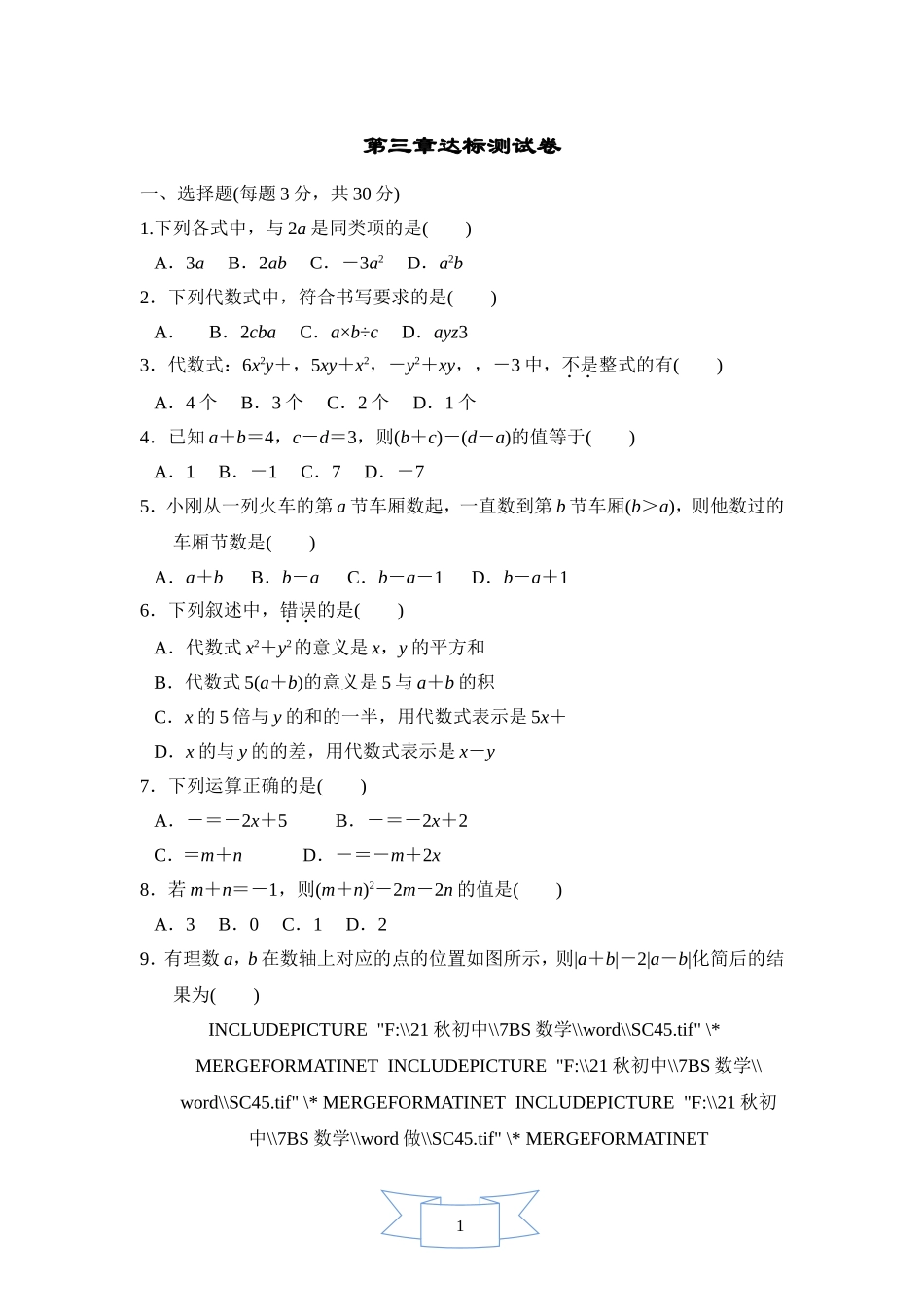 1第三章达标测试卷一、选择题(每题3分,共30分)1.下列各式中,与2a是同类项的是()A.3aB.2abC.-3a2D.a2b2.下列代数式中,符合书写要求的是()A.B.2cbaC.a×b÷cD.ayz33.代数式:6x2y+,5xy+x2,-y2+...