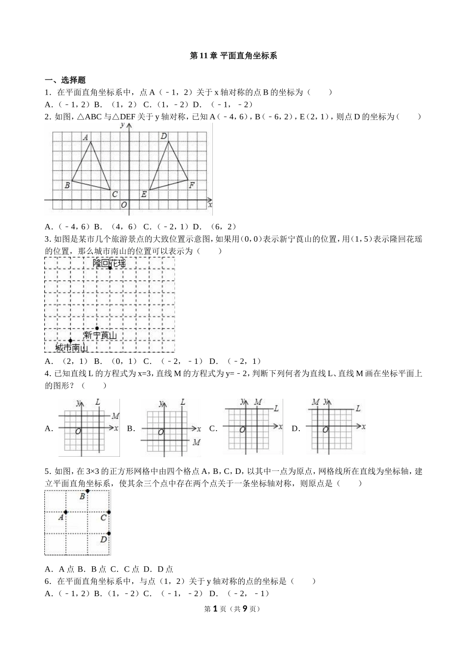 第11章平面直角坐标系一、选择题1.在平面直角坐标系中,点A(﹣1,2)关于x轴对称的点B的坐标为()A.(﹣1,2)B.(1,2)C.(1,﹣2)D.(﹣1,﹣2)2.如图,△ABC与△DEF关于y轴对称,已知A(﹣4,6),...