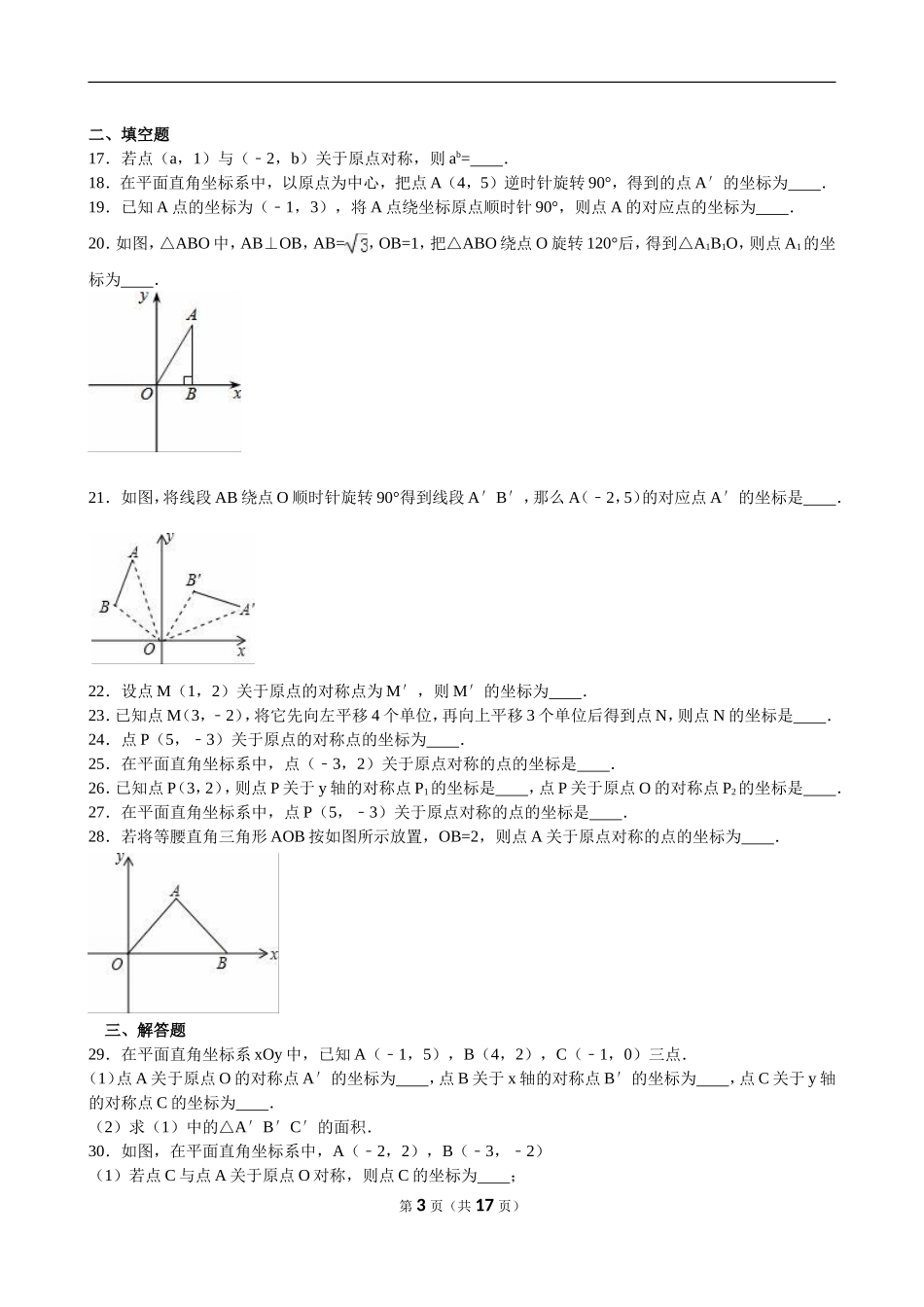 第11章平面直角坐标系一、选择题1.在平面直角坐标系中,已知点P的坐标是(﹣1,﹣2),则点P关于原点对称的点的坐标是()A.(﹣1,2)B.(1,﹣2)C.(1,2)D.(2,1)2.△ABO与△A1B1O在平面直角坐标系...