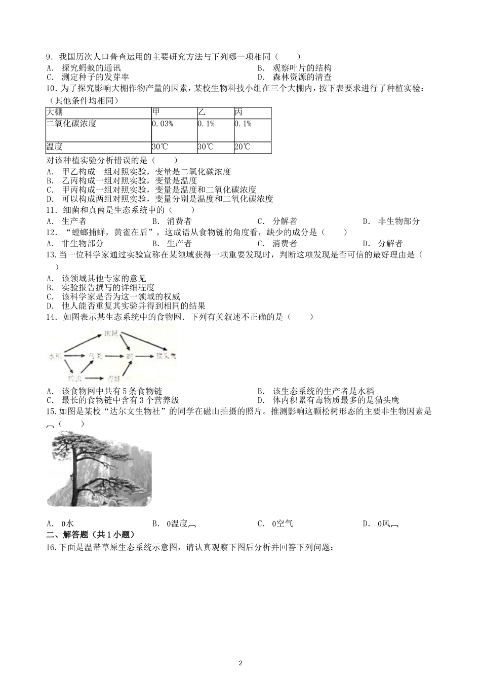 初中生物七年级上人教版单元检测2卷1.2了解生物圈.doc_第2页
