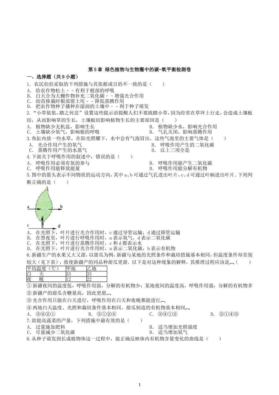 第5章绿色植物与生物圈中的碳-氧平衡检测卷一、选择题(共9小题)1.农民伯伯采取的下列措施与其依据或目的不一致的是()A.给农作物松土﹣﹣有利于根部的呼吸B.白天合为大棚作物补充二氧化碳﹣﹣增强光合作用C...