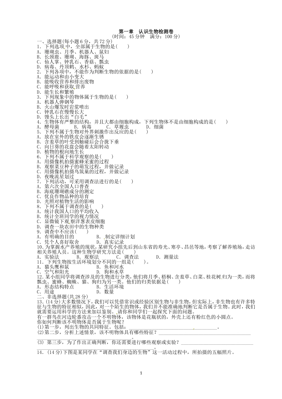 第一章认识生物检测卷(时间:45分钟满分:100分)一、选择题(每小题6分,共72分)1.下列选项中,全部属于生物的是()A.珊瑚虫、月季、机器人、鼠妇B.长颈鹿、珊瑚、海豚、斑马C.仙人掌、钟乳石、香菇、瓢虫D.病...