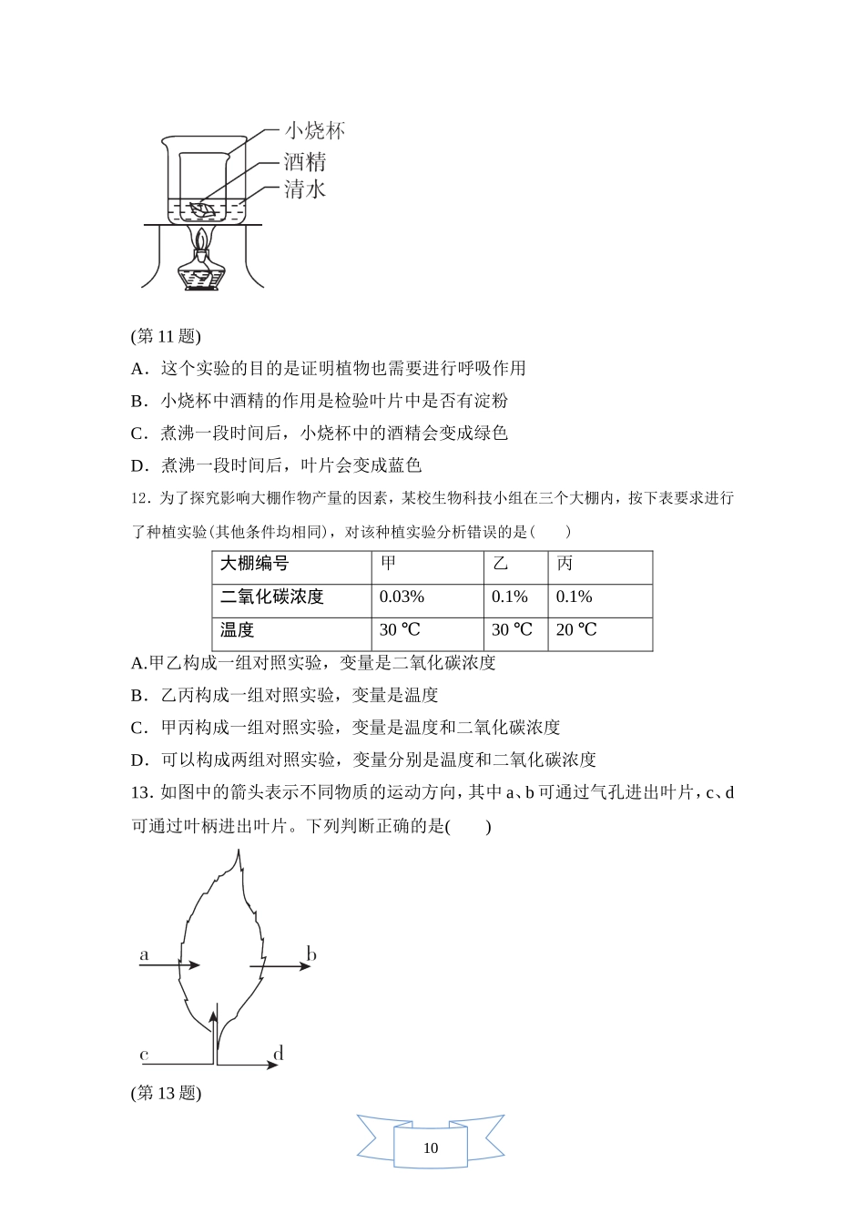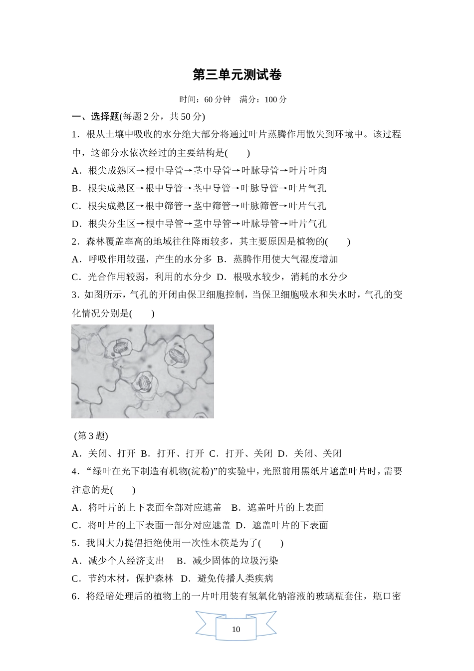 10第三单元测试卷时间:60分钟满分:100分一、选择题(每题2分,共50分)1.根从土壤中吸收的水分绝大部分将通过叶片蒸腾作用散失到环境中。该过程中,这部分水依次经过的主要结构是()A.根尖成熟区→根中导管→茎...