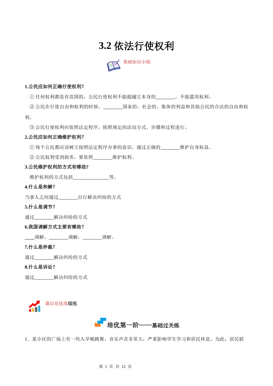 第1页共12页基础知识小练课后培优练级练3.2依法行使权利1.公民应如何正确行使权利?①任何权利都是有范围的,公民行使权利不能超越它本身的,不能滥用权利。②公民在行使自由和权利的时候,国家的、社会的、集体...