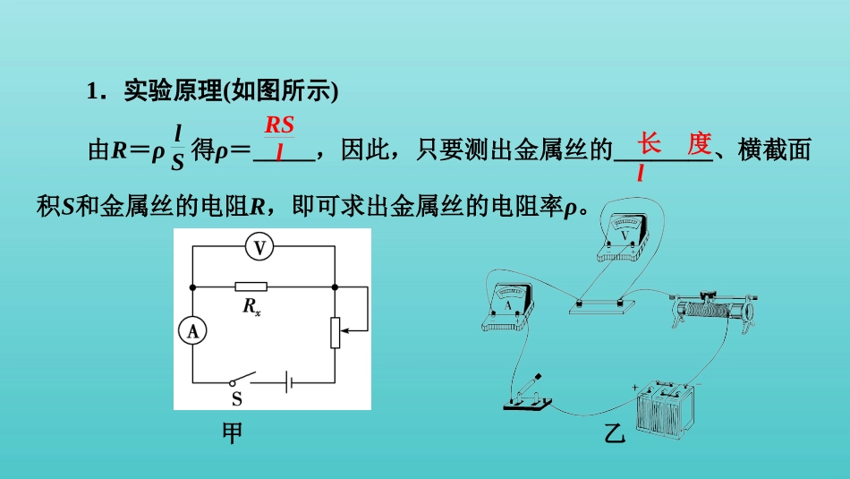 实验十测定金属丝的电阻率1实验知识·自主回顾1.实验原理(如图所示)由R=ρlS得ρ=_____,因此,只要测出金属丝的________、横截面积S和金属丝的电阻R,即可求出金属丝的电阻率ρ。长度l甲乙RSl2.实验器材被测...